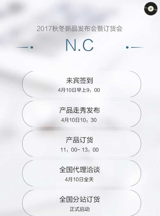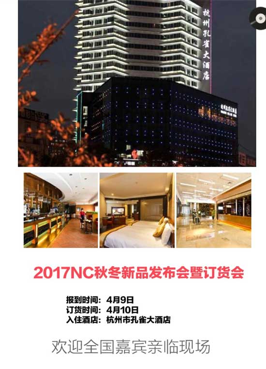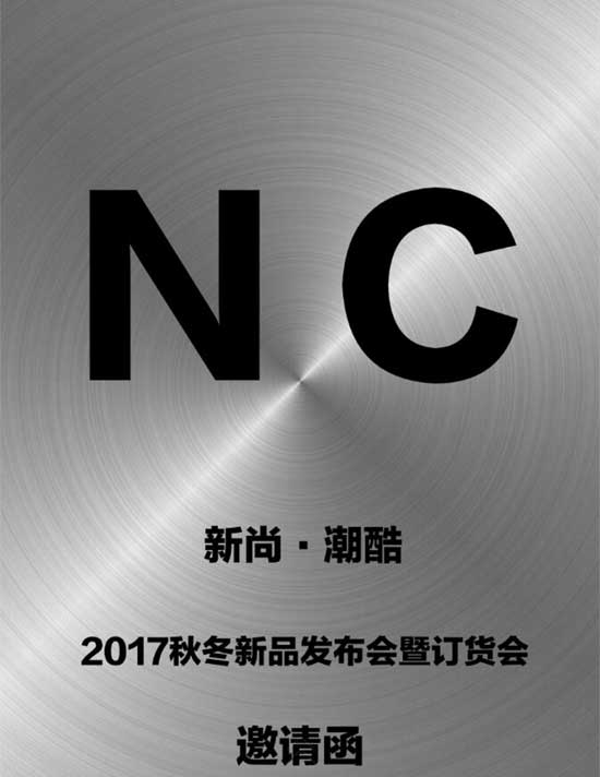 “NC”秋冬大秀即將拉開序幕,潮流新翻,任你釋放,GO!GO!WE ARE FAMILY!2017秋冬新品發布會暨訂貨會(杭州)約起,期待4月10日相約杭州全國首播。